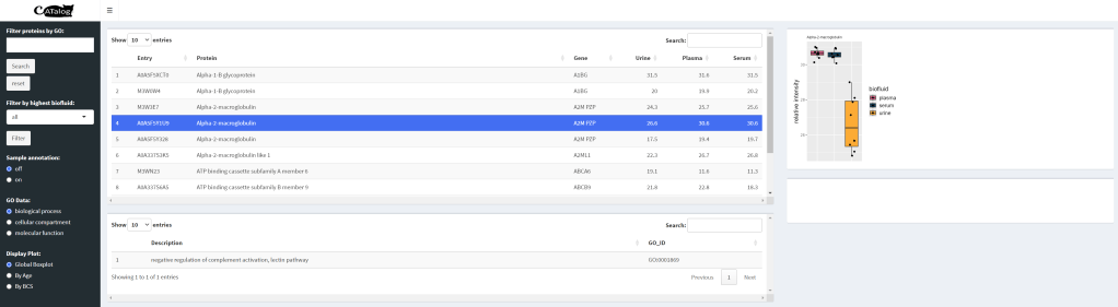 CATalog is an interactive application built in Rshiny that allows users to easily visualize protein information for the purposes of biomarker discovery. Currently, the application hosts 2000 proteins from the feline proteome. Protein data is presented in terms of relative abundance across three different biofluids Integration of gene ontology (GO) information allows for a more detailed view of each protein’s biological function, allowing for individual biomarker selection.