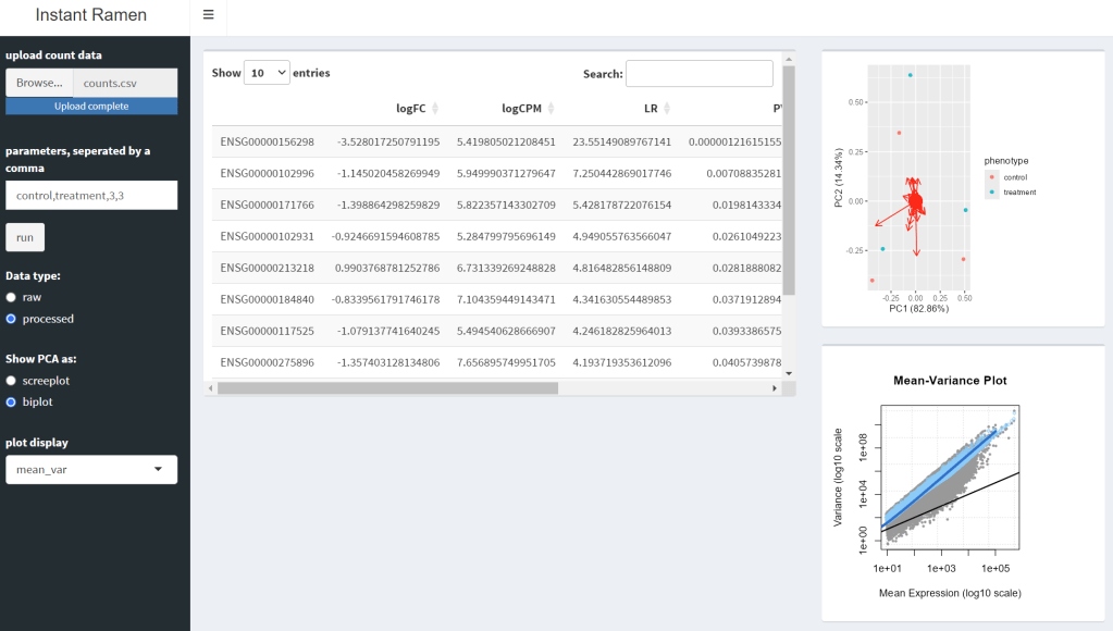 InstantRamen is an Rshiny application designed to facilitate RNAseq analysis using an EdgeR based pipeline. The program was designed with Gene Expression Omnibus (GEO) data in mind, identifying statistically significant DEGs (differently expressed genes) and visualizing the results. Additionally, annotation features are included, creating an more intuitive set of results.